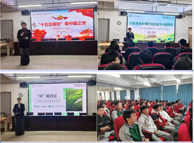 宣讲团成员陈青以“‘十五五’规划看中国之变”为主题,回顾了我国十四个五年规划的辉煌成就,展望了“十五五”时期在教育、科技、生态等领域的发展蓝图,激励同学们将个人成长融入国家发展;成员霍元涛“以农业农村现代化绘就乡村新图景”为主题,主要聚焦乡村的新变化、乡村振兴的巨大优势以及青少年的使命担当等方面,解读了“三农”问题作为全党工作重中之重的深刻内涵;成员赵若男以“‘碳’秘日记”为主题,用方大九钢的绿色转型、南昌马拉松的碳普惠实践等江西本地生动案例,科普了碳达峰碳中和知识,传递了绿色低碳的生活理念。