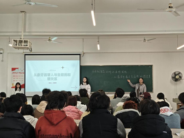 2025年12月9日下午,一堂主题为“社会主义生态文明的道德实践”的思政课在东华理工大学枫林校园图书馆402教室展开。马克思主义学院教师张晓伟与美术与设计学院学生胡丽玲、李佳怡同台授课,围绕“人与自然和谐共生的关系”同台教学。