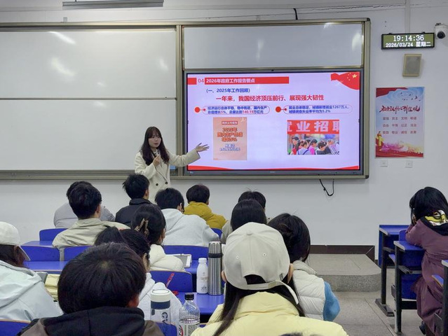 宣讲中,曾淑婷围绕十四届全国人大四次会议和全国政协十四届四次会议基本情况,重点解读了2026年政府工作报告要点,回顾了2025年我国经济社会发展取得的扎实成效,阐释了“十五五”时期主要目标及2026年经济增长4.5%—5%等预期任务。她聚焦“‘十五五'开局”“积极有为”“投资于人”“智能经济”“投融资综合改革”等热点关键词,结合青年成长实际与校园生活,把宏观政策转化为易懂可学的青春话语,引导同学们将个人发展融入国家发展大局。