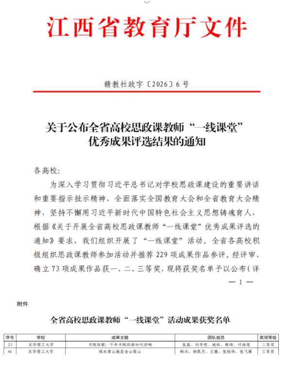 3月29日,江西省教育厅公布全省高校思政课教师“一线课堂”优秀成果评选结果,东华理工大学2项成果入选。其中,张磊老师团队的作品《书院弦歌:千年书院的新时代回响》获二等奖;韩冰老师团队的作品《绿水青山就是金山银山》获三等奖。